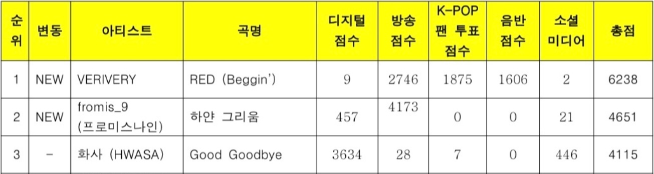 fromis_9’s “White Memories” came in second place with a score of 4,651, while MAMAMOO’s Hwasa’s “Good Goodbye” ranked third with a score of 4,115.