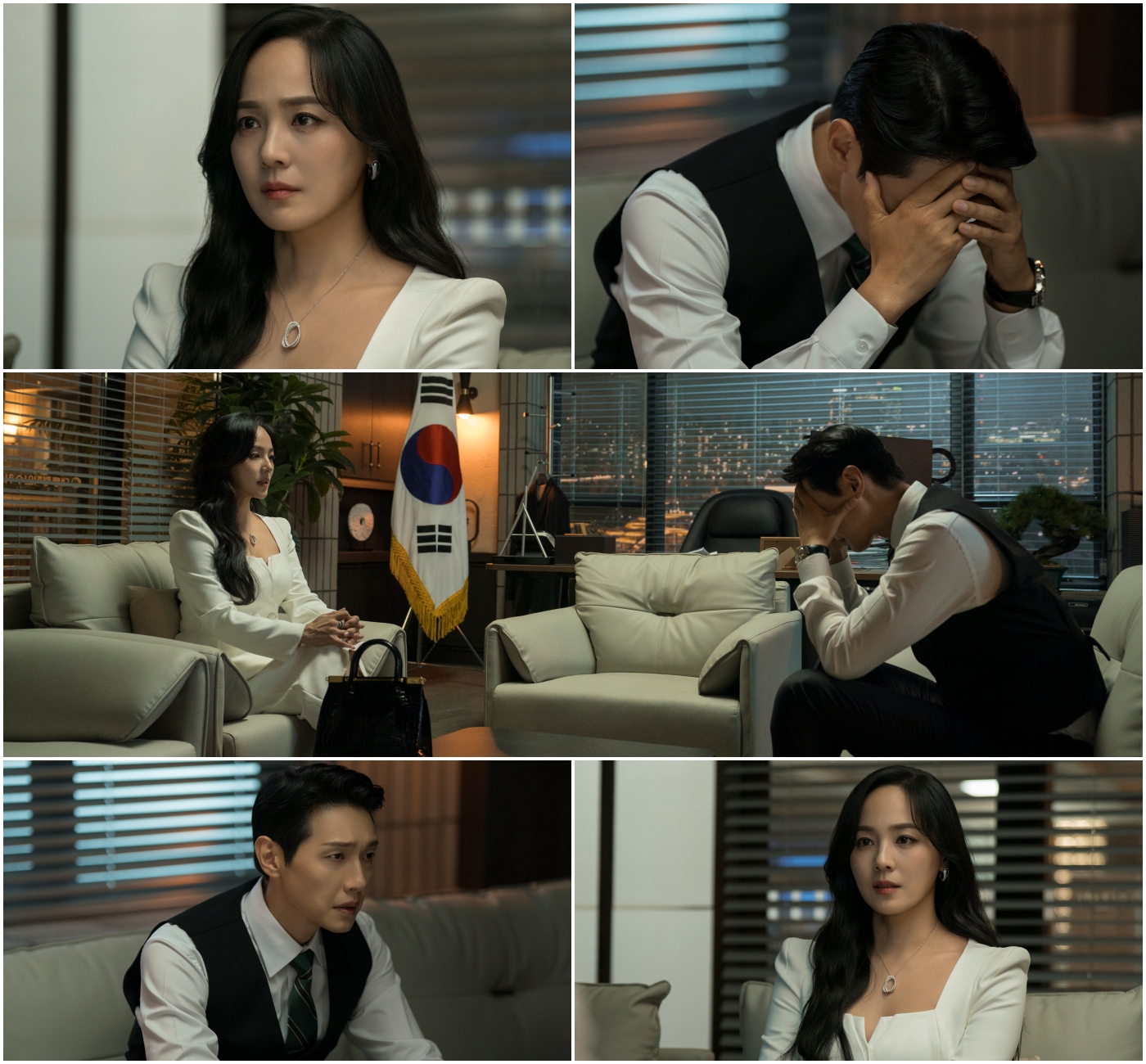 The newly released stills hint at a confrontation between Cha Soo Yeon and Hyun Min Chul that feels like the calm before a storm. In the stills, Cha Soo Yeon and Hyun Min Chul sit across from each other in a chilling silence. With cold, unyielding eyes, Soo Yeon hurls sharp words at her husband, while Min Chul buries his face in his hands in shock and despair. As both unleash their bitter truths in a battle that could seal their fates, all eyes are on how this decisive showdown will unfold.