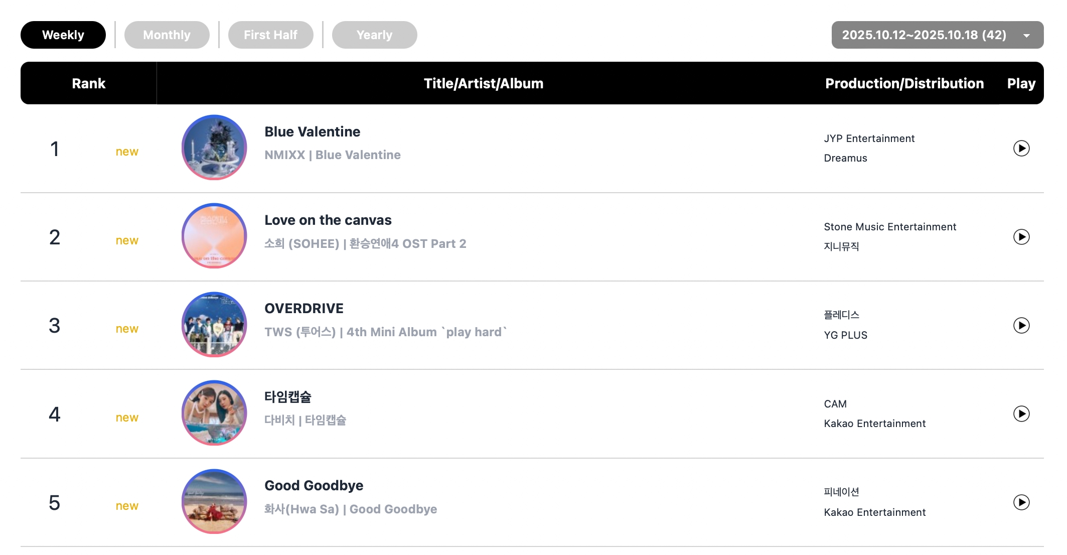 TWS’s new title track “OVERDRIVE” debuted at No. 3, trailed by Davichi’s “TIME CAPSULE” at No. 4 and MAMAMOO’s Hwasa’s “Good Goodbye” at No. 5.