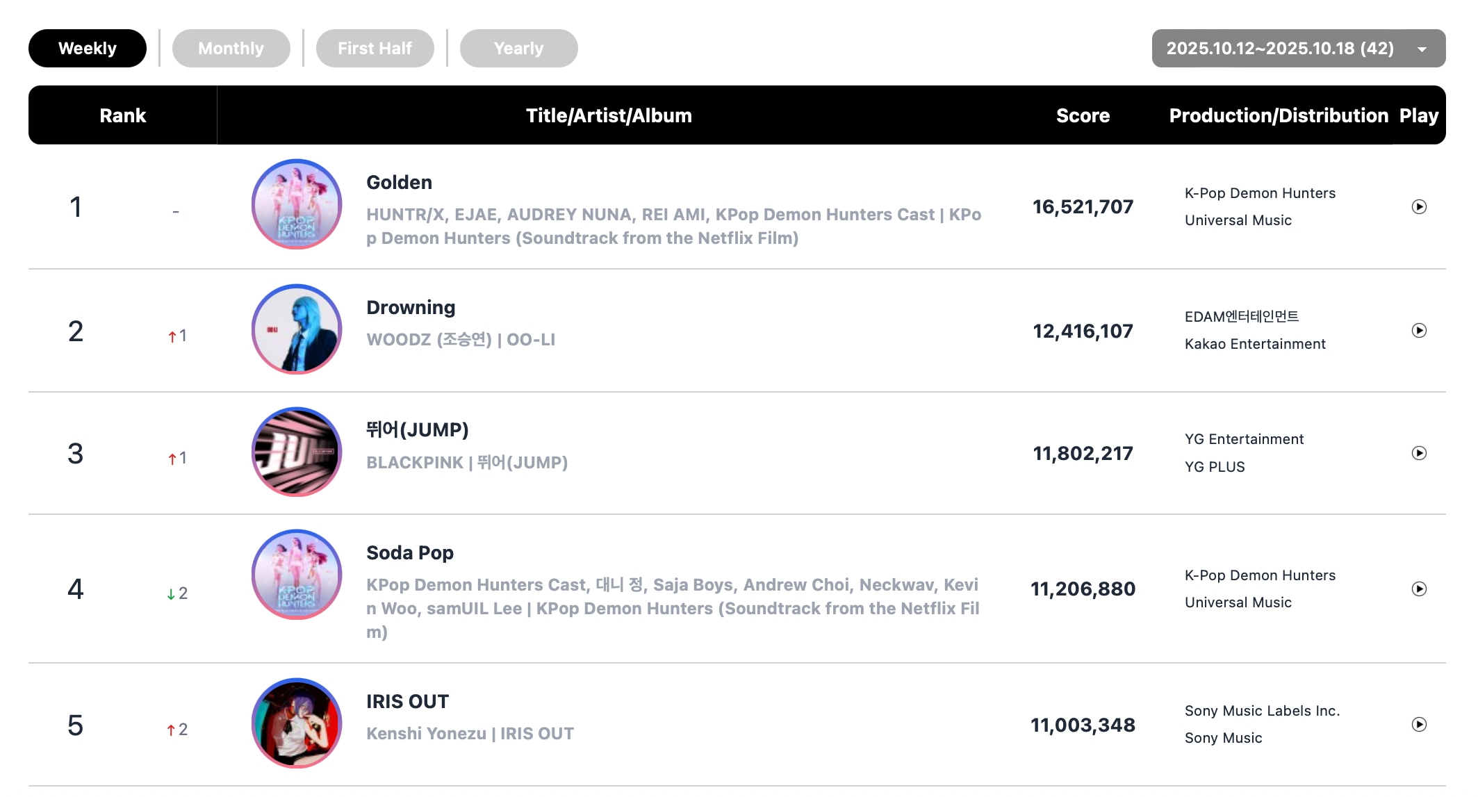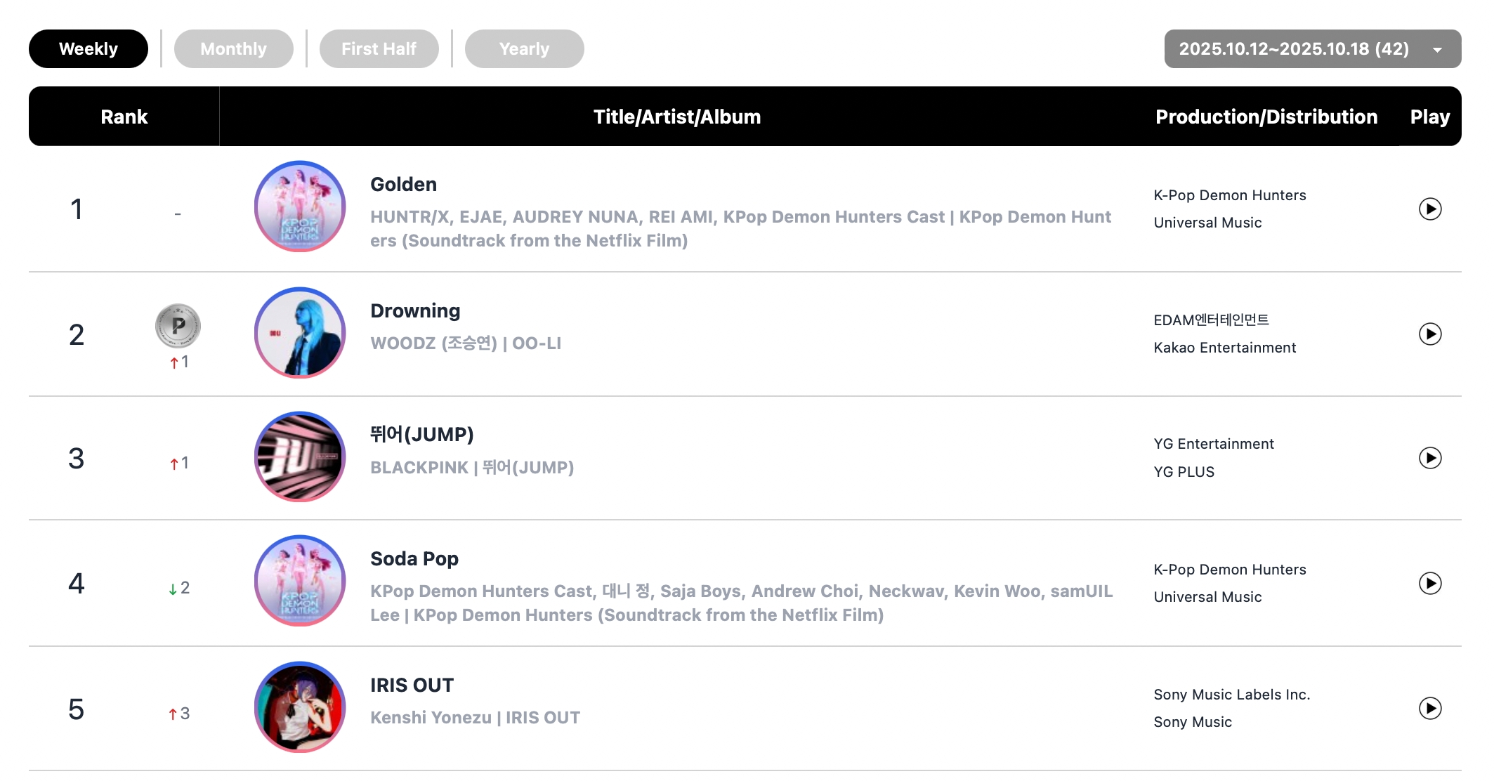 The top five songs on this week’s overall digital chart and streaming chart were exactly the same: HUNTR/X’s Golden” (sung by EJAE, Audrey Nuna, and Rei Ami) stayed No. 1 on both charts, followed by WOODZ (Cho Seung Youn)’s “Drowning” at No. 2 and BLACKPINK’s “JUMP” at No. 3.