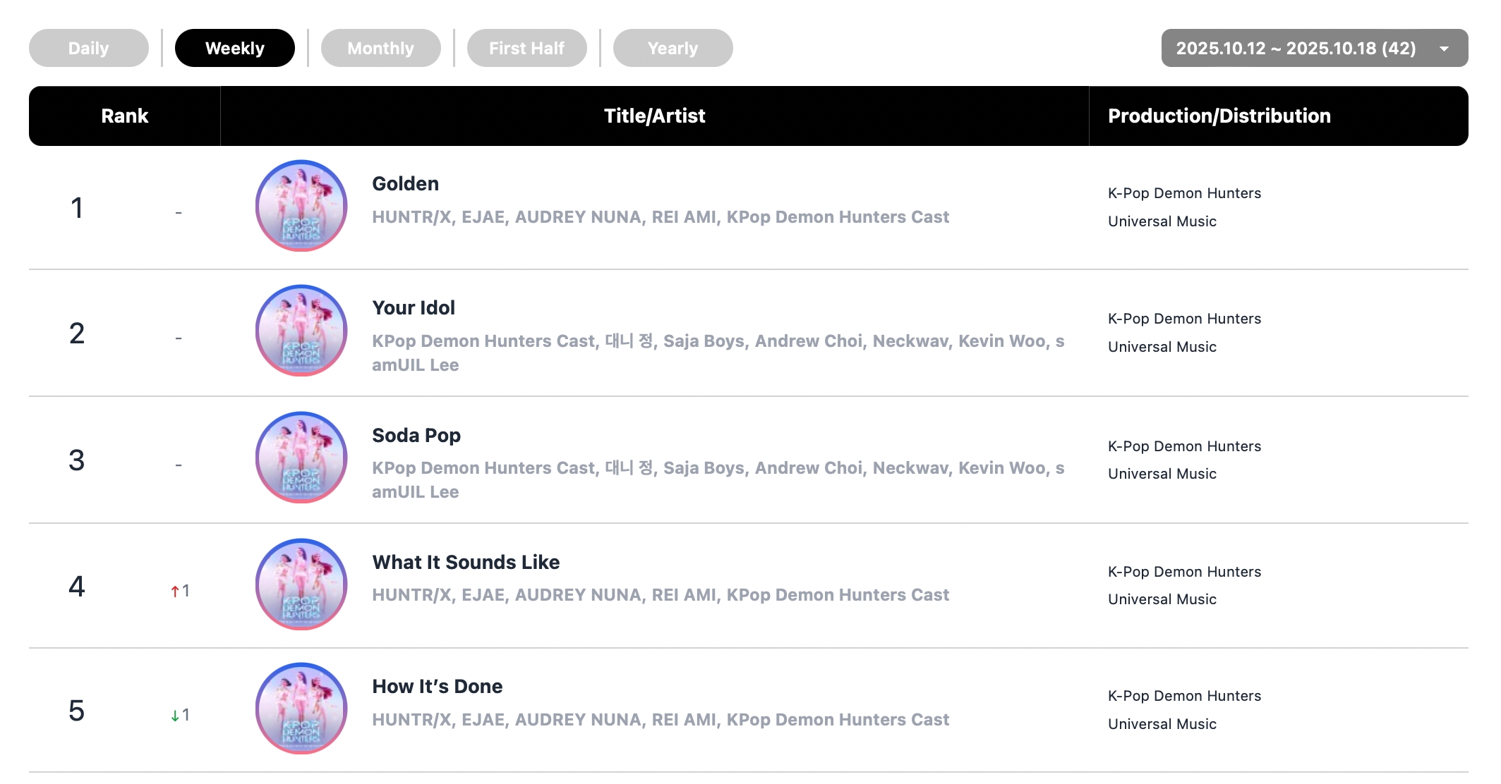 Fictional girl group HUNTR/X from the animated film “KPop Demon Hunters” maintained their triple crown on the charts this week, with their smash hit “Golden” remaining No. 1 on the overall digital chart, streaming chart, and global K-pop chart.