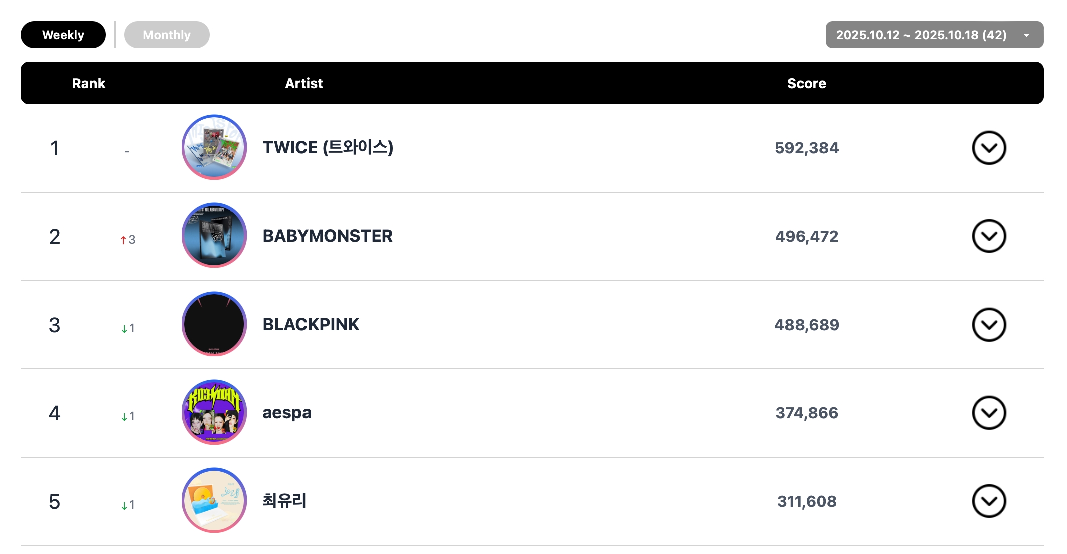 TWICE continued their reign at No. 1 on the social chart this week, while BABYMONSTER jumped to No. 2.