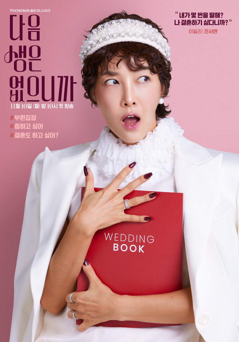 Jin Seo Yeon plays Lee Il Li, a single senior editor of a magazine who still harbors fantasies about marriage. Wearing a white dress reminiscent of a wedding gown and a matching headband, she clutches a wedding book with a surprised expression, embodying her conflicting desires. Her quote, “How many times do I have to say it? I don’t want to get married!” alongside the hashtag “Do you actually want to get married?” humorously reveals her ironic longing for the very thing she claims to reject.