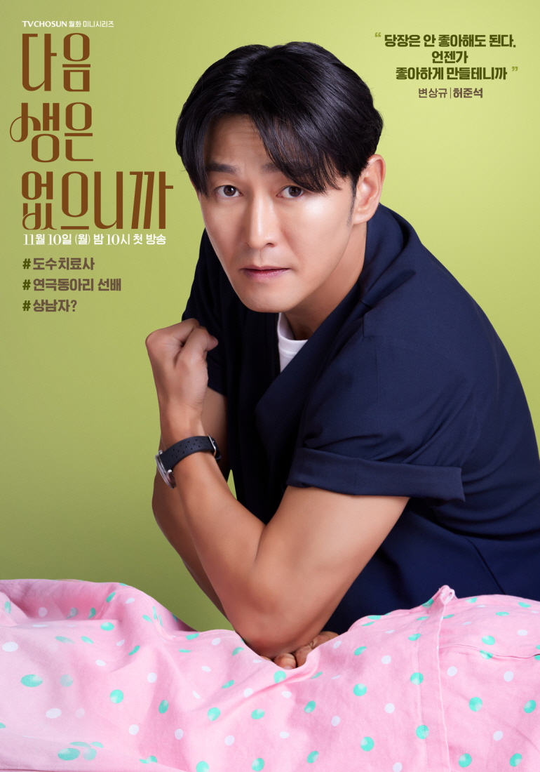 Heo Joon Suk plays Byun Sang Gyu, a physical therapist and the three women’s former college theater club senior. Showing off his toned arms as he focuses on a therapy session, his poster exudes unexpected masculine charm. His quote, “It’s okay if you don’t like me now—I’ll make you fall for me eventually,” paired with the tag “Manly guy?” perfectly captures his straightforward confidence.