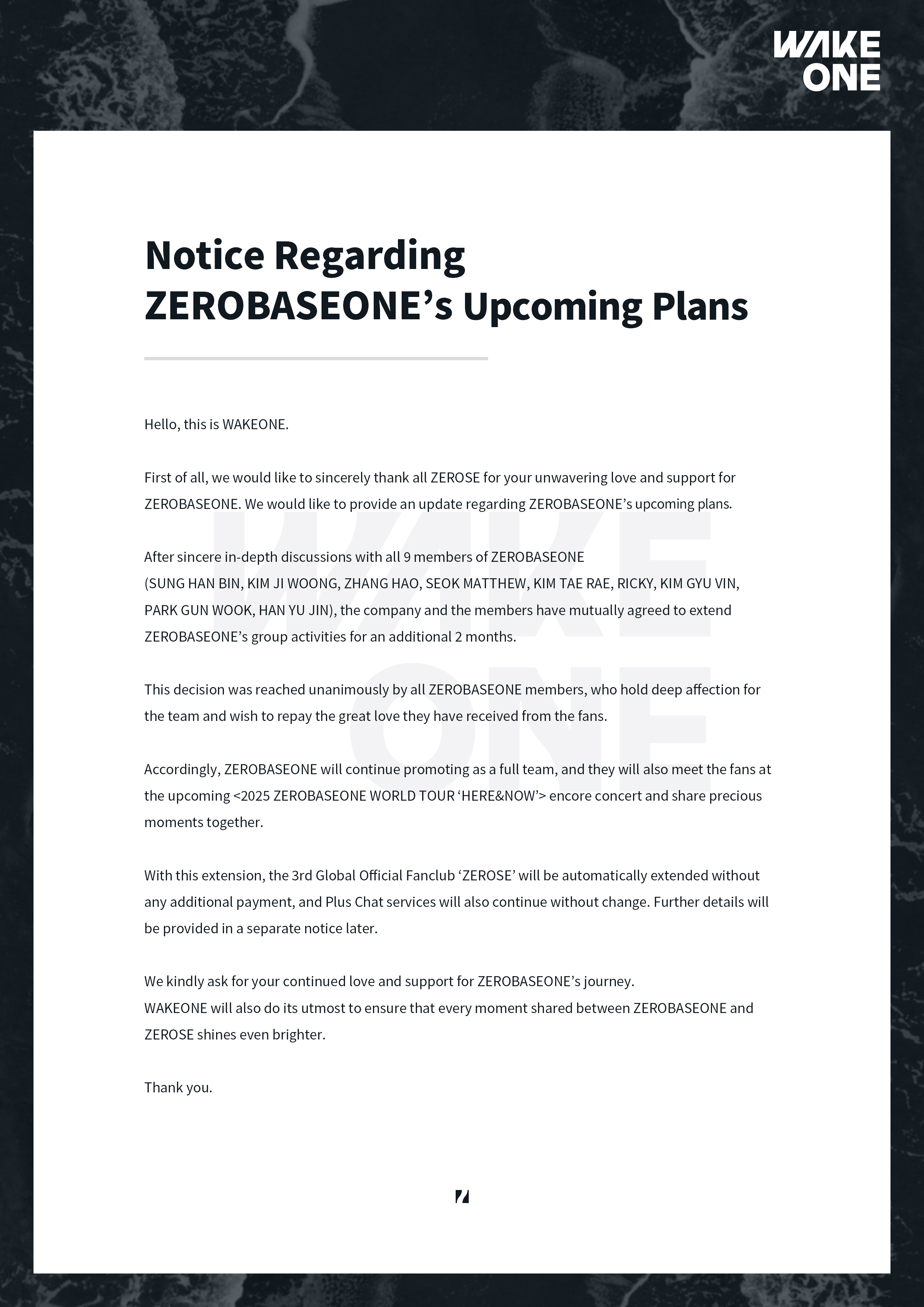 Following the official notice, WAKEONE also revealed through media outlets that the group is preparing new music in addition to their encore concert. ZEROBASEONE’s activities are now scheduled to conclude in March 2026.