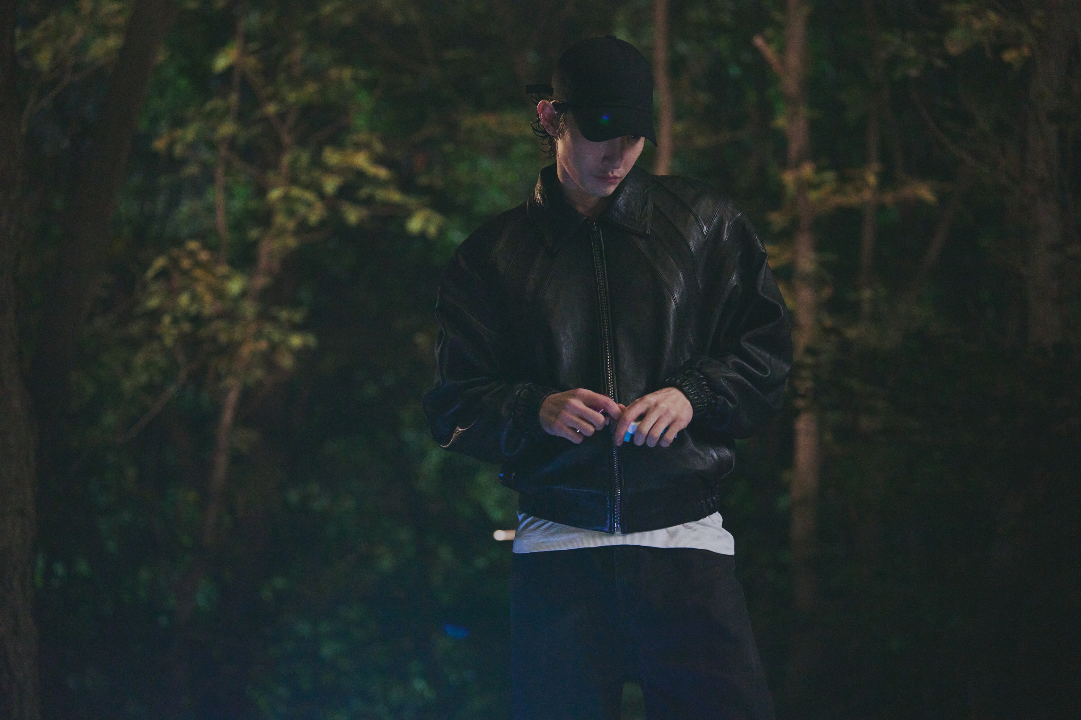 In another still, Tae Su stands deliberately against the backdrop of a dark forest, creating tension and hinting at the dangerous events that could unfold in the remote location.