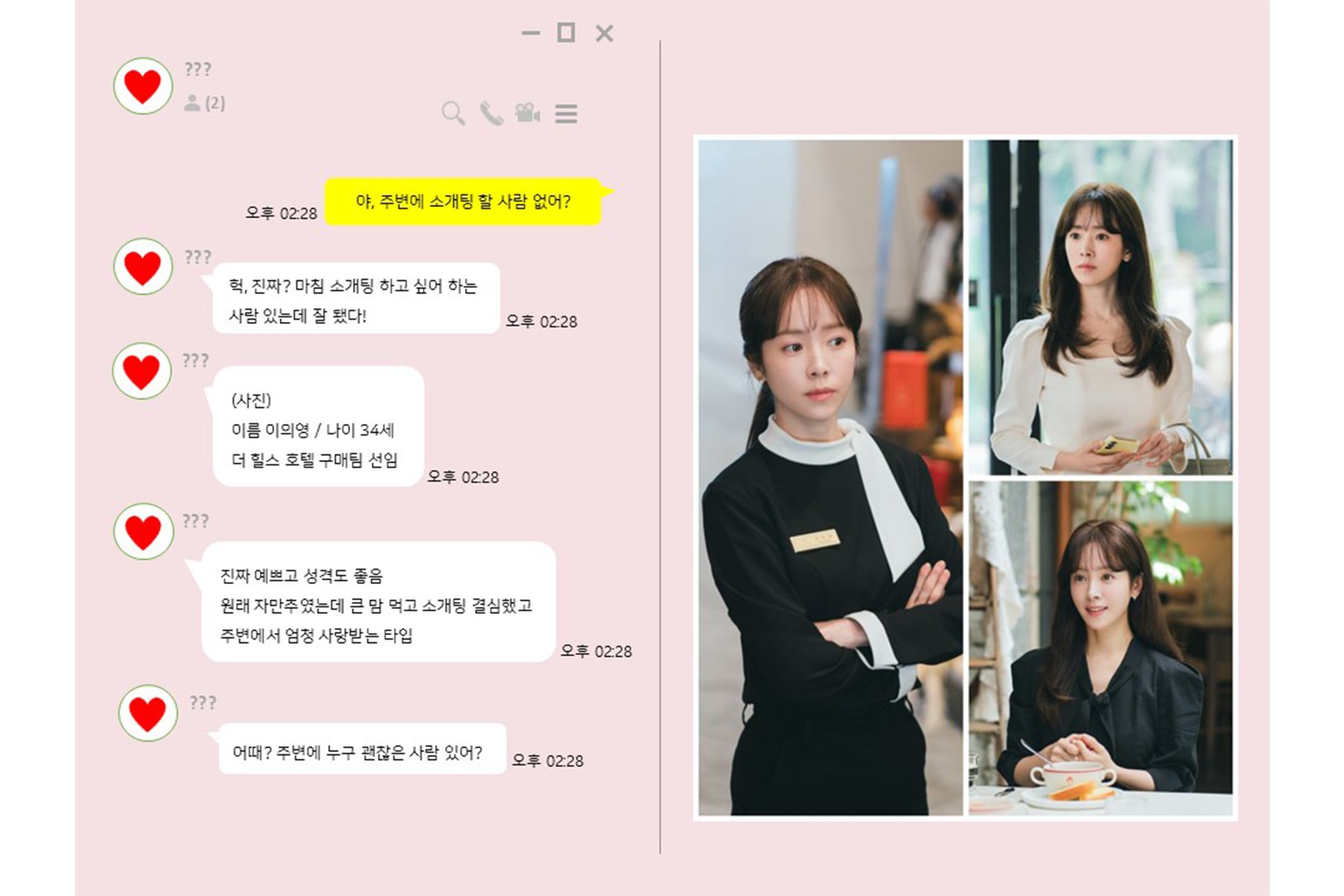 In the still below, a message thread arranging a blind date for Lee Ui Young draws attention. The scene—where age, job, and even photos are shared as they actively search for a match—realistically captures the awkward first step of an adult trying to find “the one” through blind dates. Just as the matchmaker says, “She’s pretty and has a good personality,” the Lee Ui Young in the photo naturally inspires affection with her gentle smile and neat, composed aura.