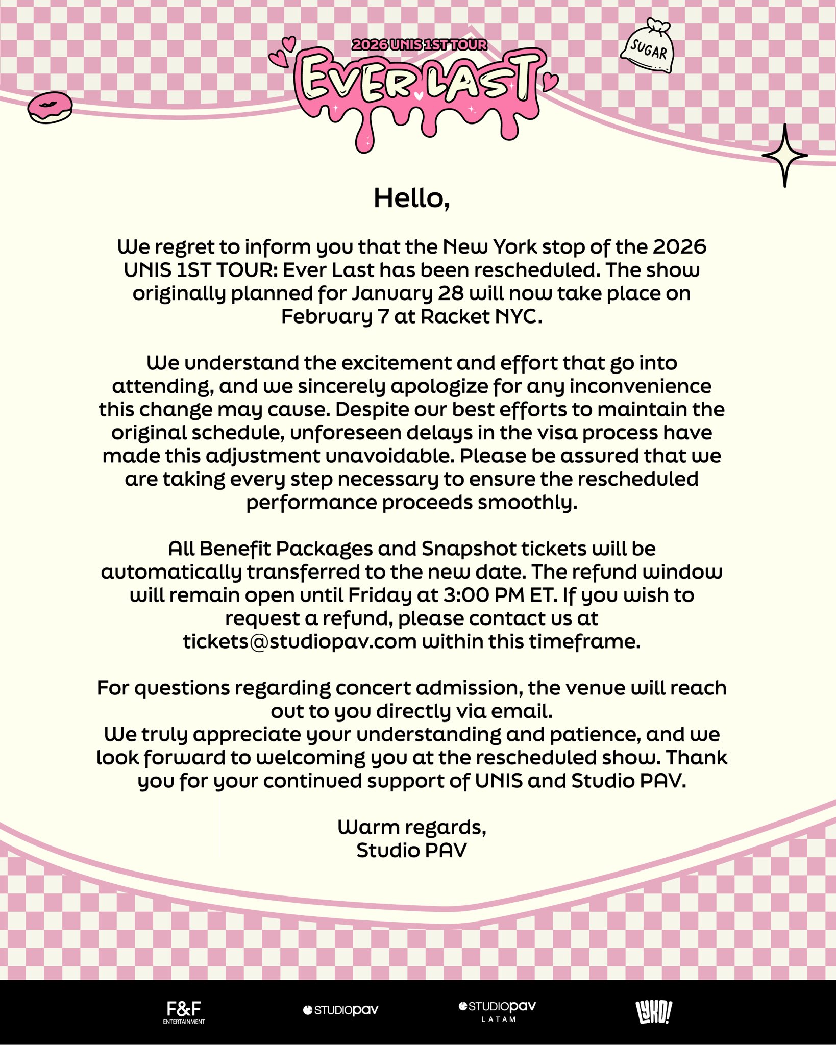 On January 21 local time, Studio PAV announced that the New York stop of UNIS’s “Ever Last” tour, which was scheduled for January 28, would now be taking place on February 7 instead. Originally, the concert was intended to be the first stop of the tour.