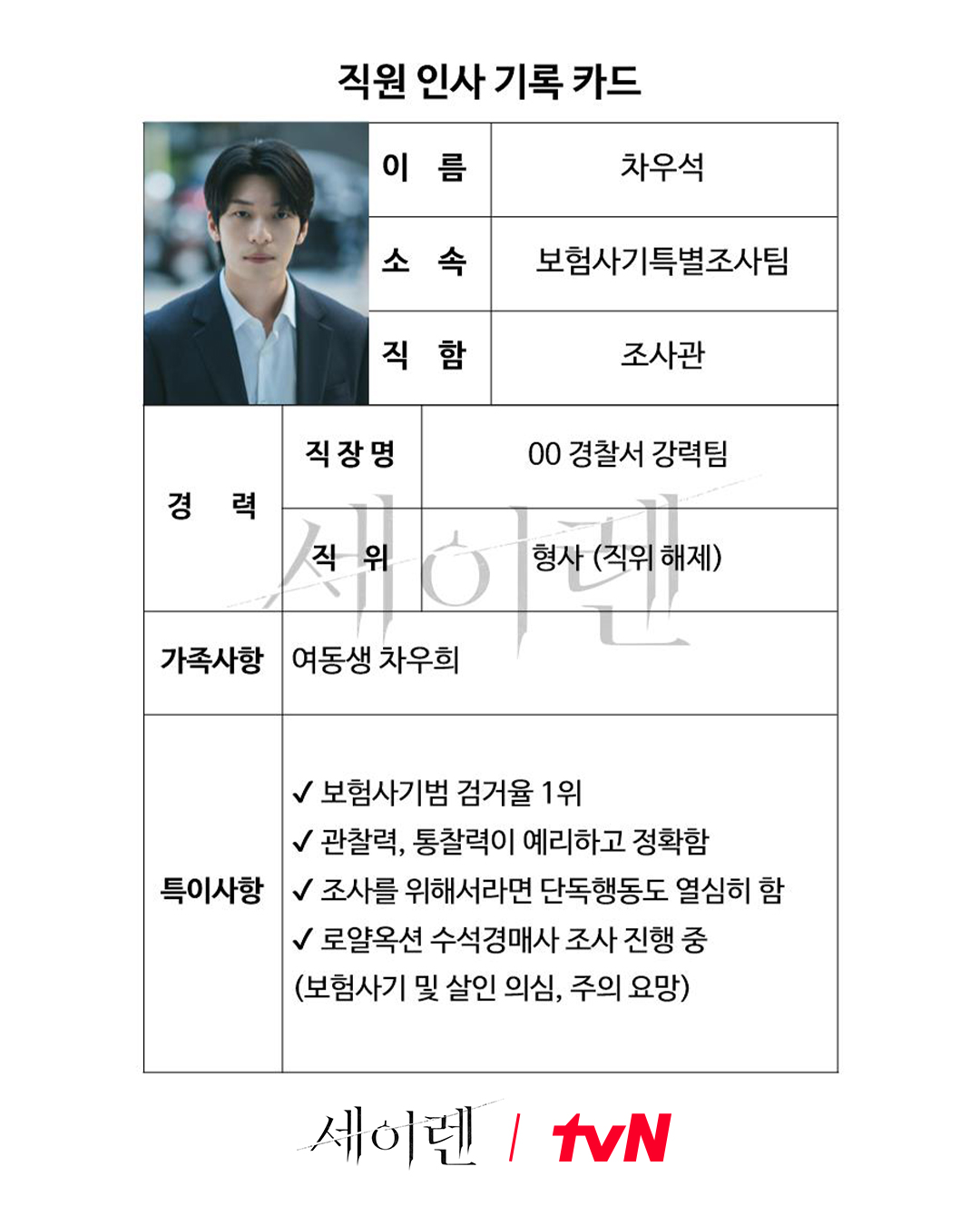 The personnel record card includes the personal details of ace insurance investigator Cha Woo Seok. The card lists everything from his department and work history to his family background and special notes. One detail stands out: He was once a detective in a violent crimes unit but has since been relieved of his post.