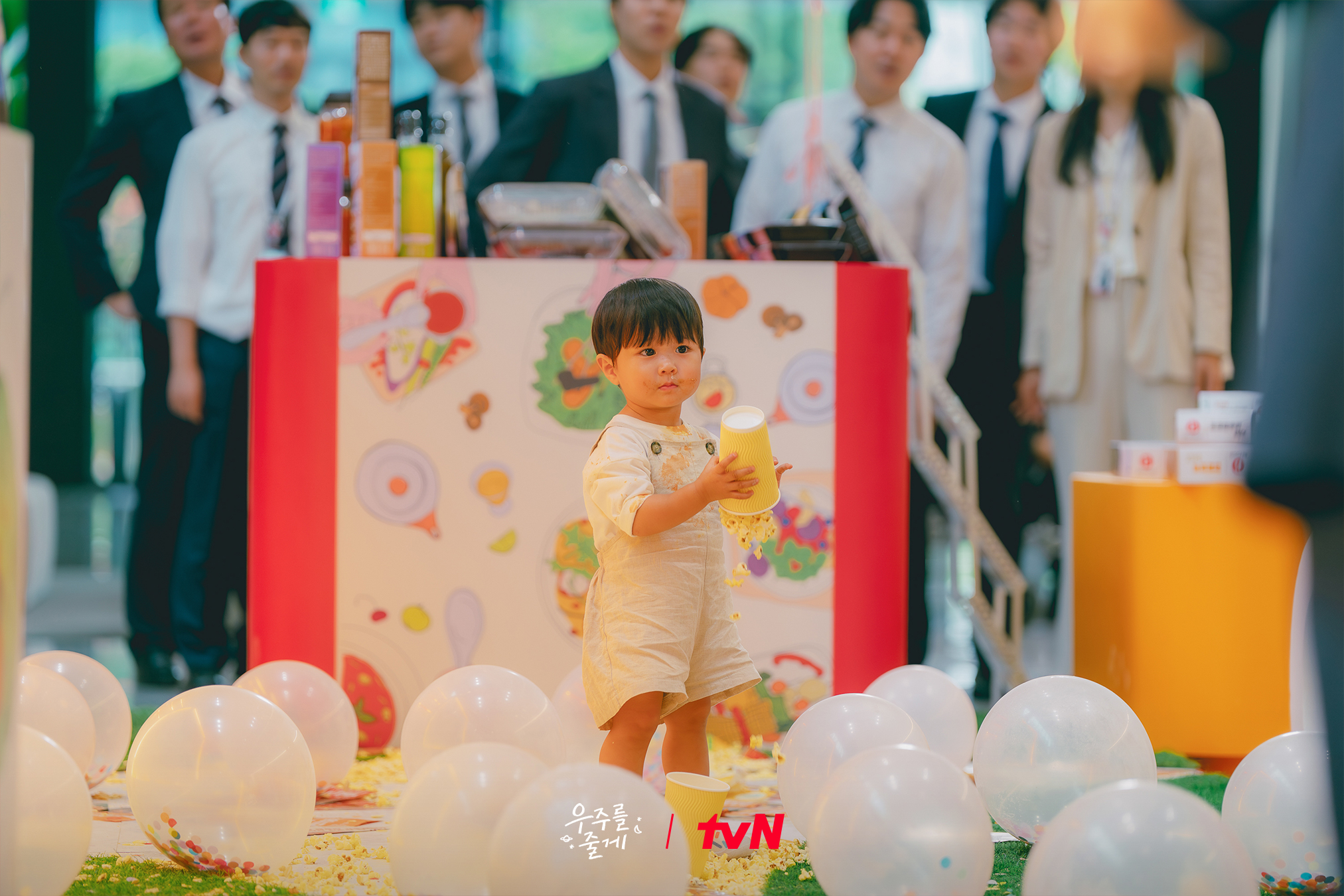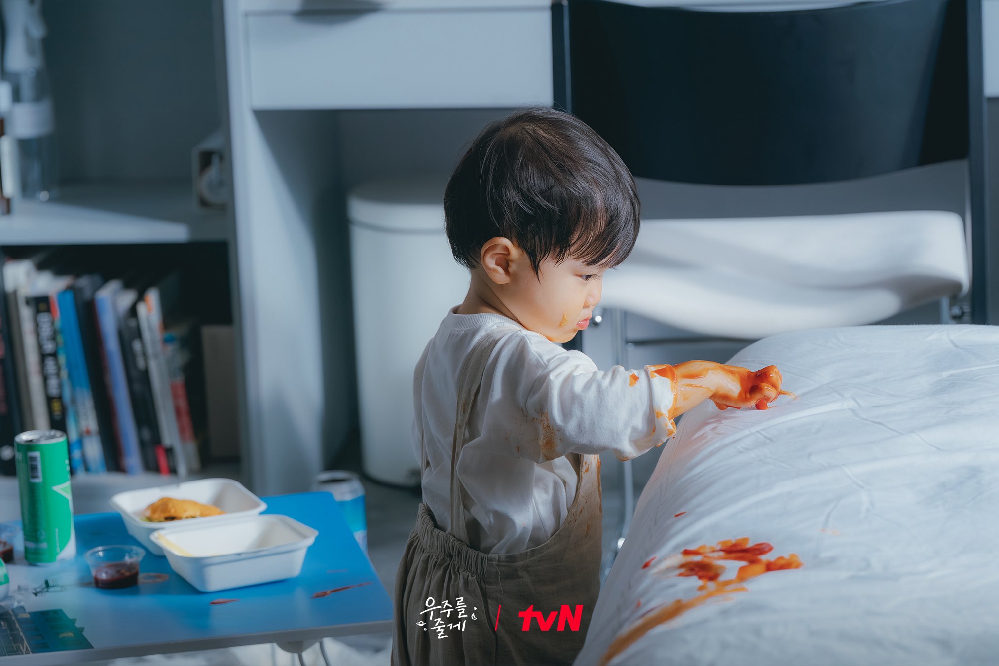 The newly released photos heighten curiosity by showing Sun Tae Hyung as Woo Joo’s one-day caretaker. In the brief moment he looks away, Woo Joo ends up spilling some unidentified sauce all over himself and turning the entire house into a complete mess. Sun Tae Hyung, thrown into total chaos, pulls his hair out, showing his distress.