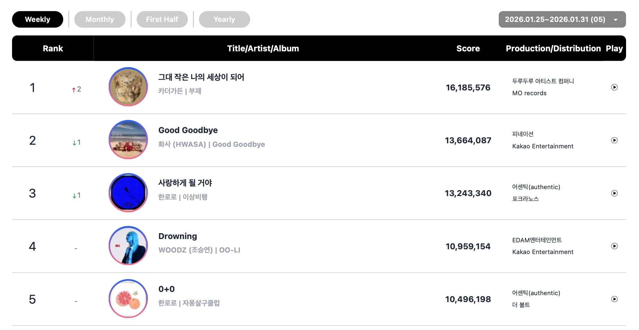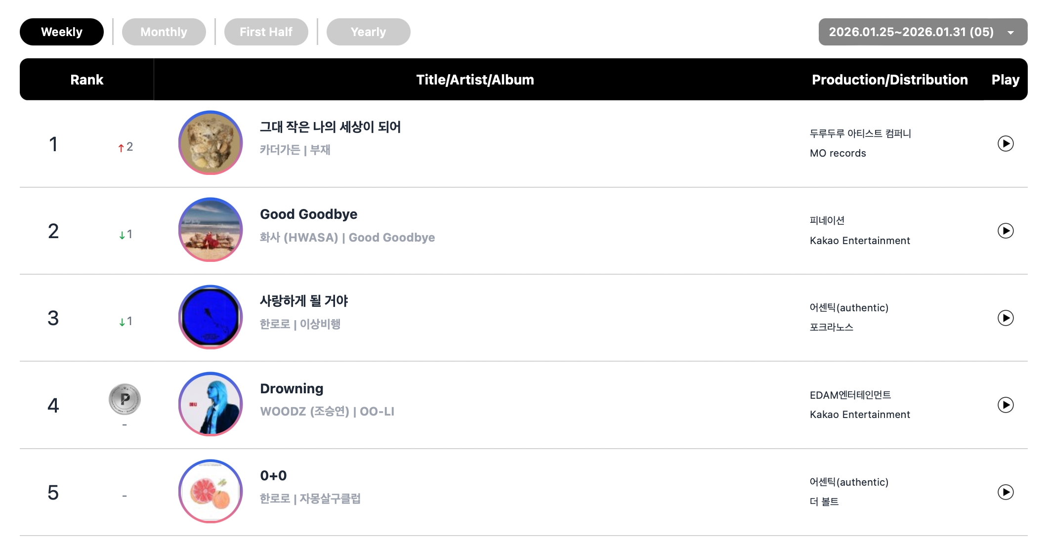 The top five songs on the overall digital chart and streaming chart were exactly the same this week: Car, the Garden’s “My whole world” took No. 1 on both charts, followed by MAMAMOO’s Hwasa’s “Good Goodbye” at No. 2, HANRORO’s “Landing in Love” at No. 3, WOODZ’s “Drowning” at No. 4, and HANRORO’s “0+0” at No. 5.