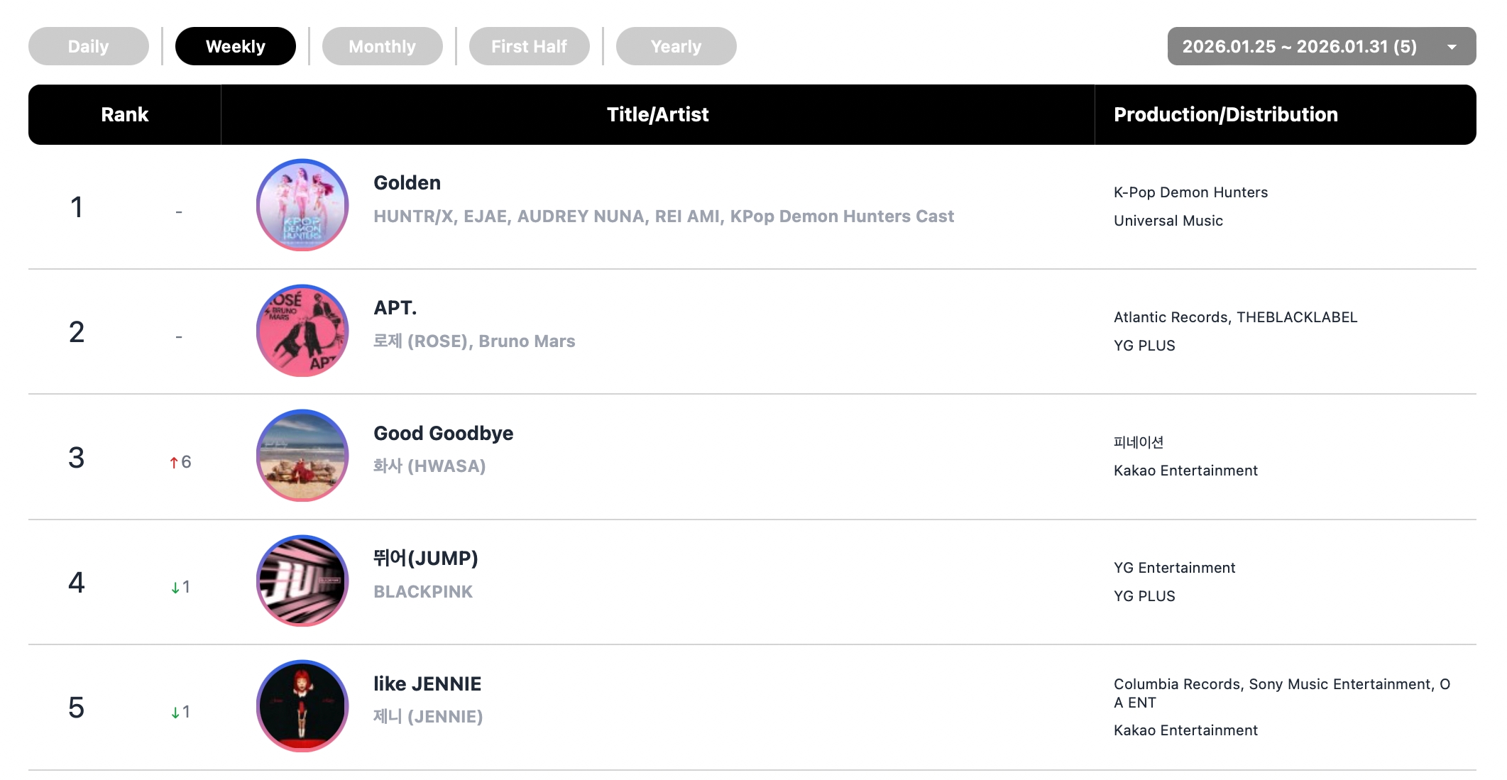 Hwasa’s “Good Goodbye” rose to No. 3, followed by BLACKPINK’s “JUMP” at No. 4 and BLACKPINK’s Jennie’s “like JENNIE” at No. 5.