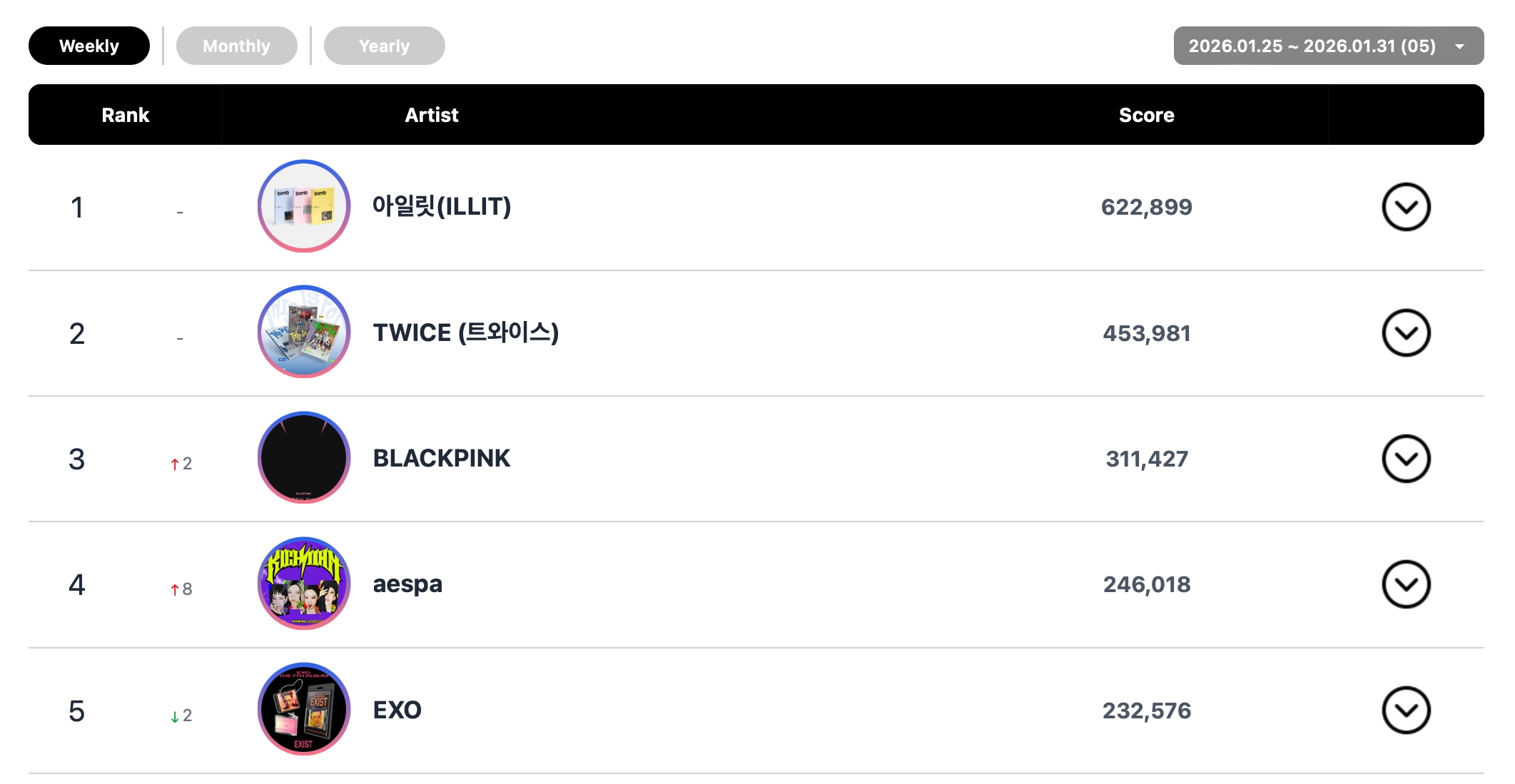 BLACKPINK climbed to No. 3 for the week, with aespa jumping to No. 4 and EXO rounding out the top five.