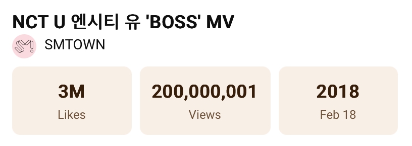 On March 6 at approximately 11:53 a.m. KST, NCT U’s music video for their 2018 hit “BOSS” surpassed 200 million views on YouTube. The video was originally released on February 19, 2018 at midnight KST, meaning that it took around 8 years and 15 days to reach the milestone.