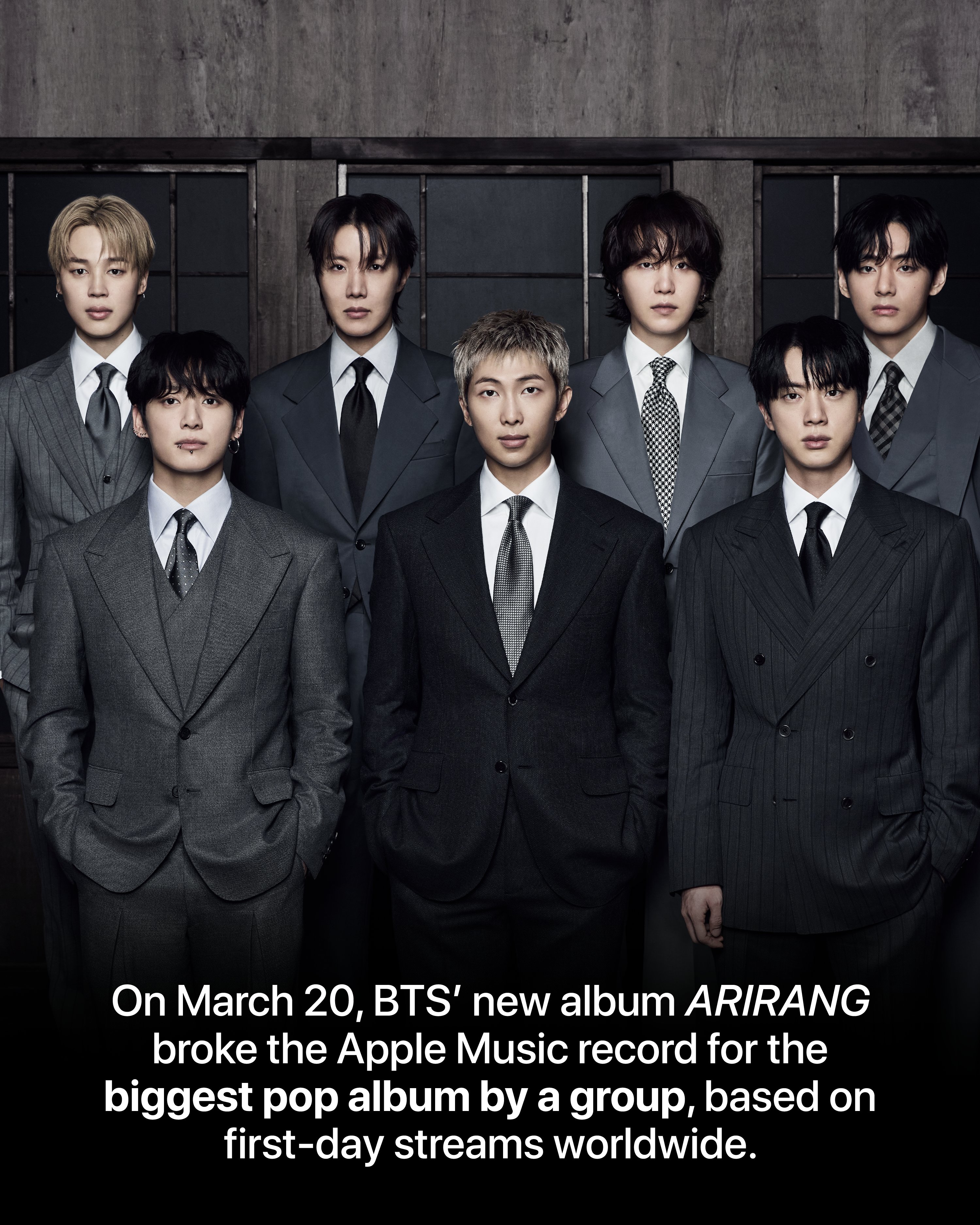 According to Apple Music, “ARIRANG” has achieved the highest first-day streams worldwide of any K-pop album in the history of the platform. It has also set a new record for the highest first-day streams worldwide of any pop album by a group from any country.