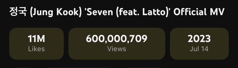 On April 10 at approximately 4:45 p.m. KST, Jungkook’s music video for his solo debut track “Seven” featuring Latto surpassed 600 million views on YouTube.
