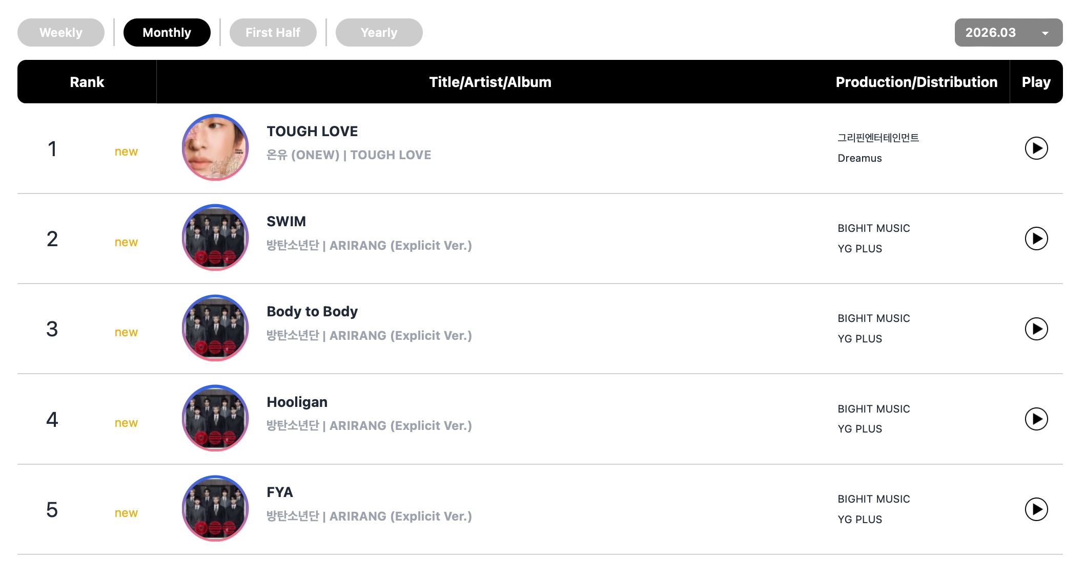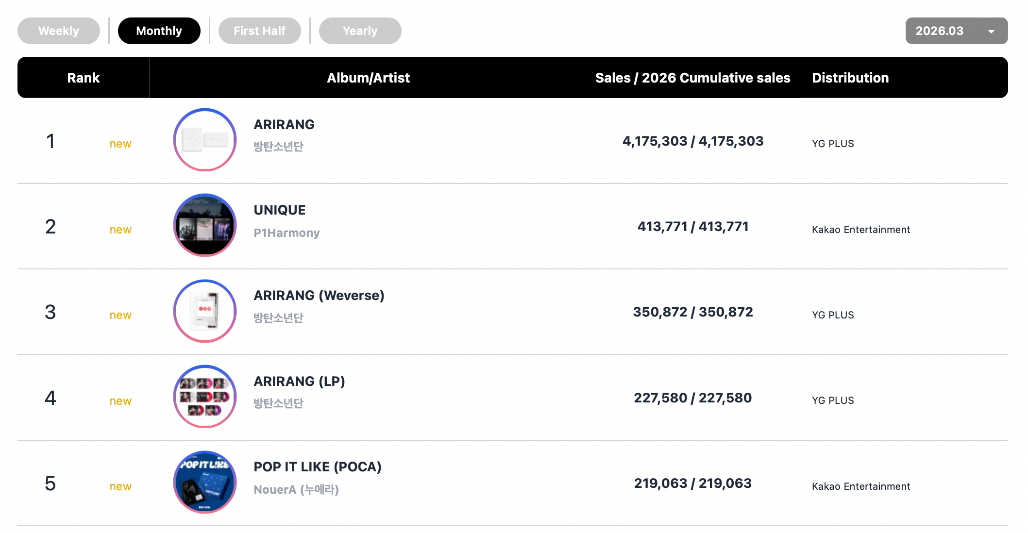 BTS swept three of the top four spots on the monthly album chart with their new album “ARIRANG.” The regular version of the album debuted at No. 1, while the Weverse and LP version charted separately at No. 3 and No. 4.