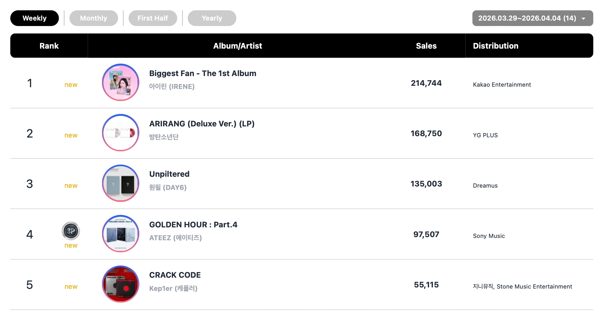 BTS’s Deluxe Vinyl version of “ARIRANG” entered the chart at No. 2, while DAY6’s Wonpil’s first solo mini album “Unpiltered” debuted at No. 3.