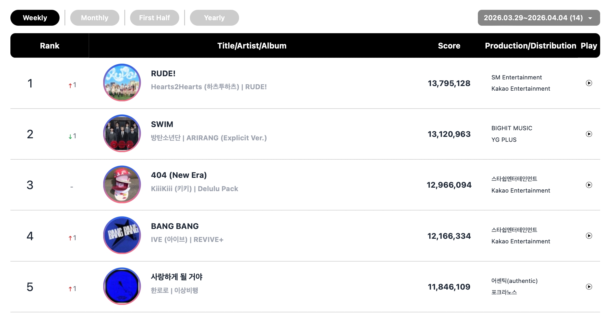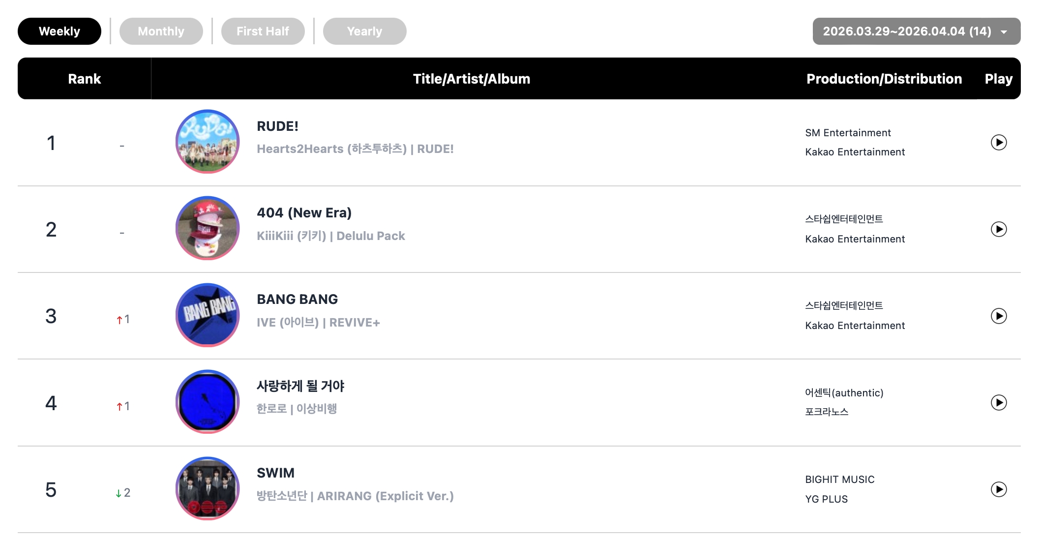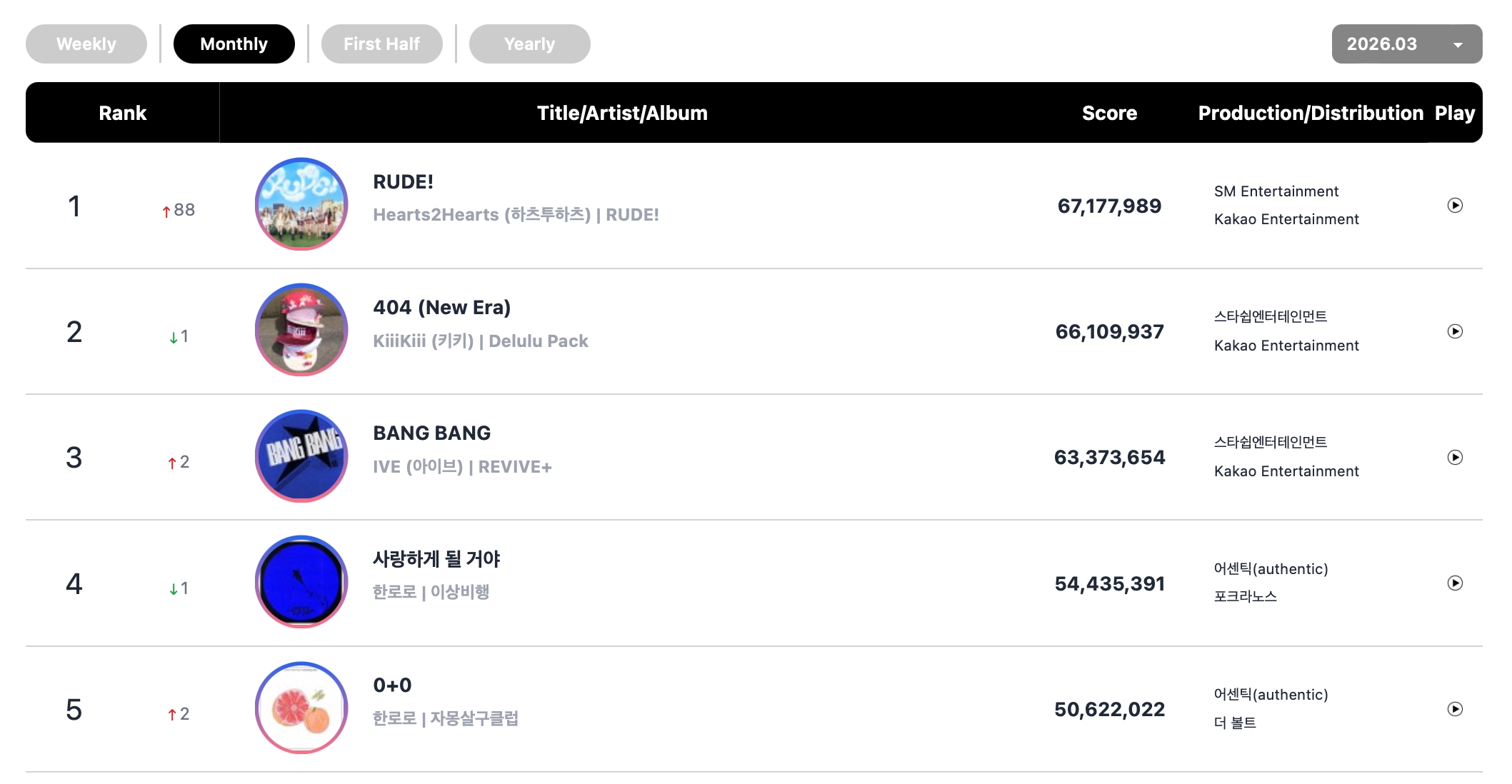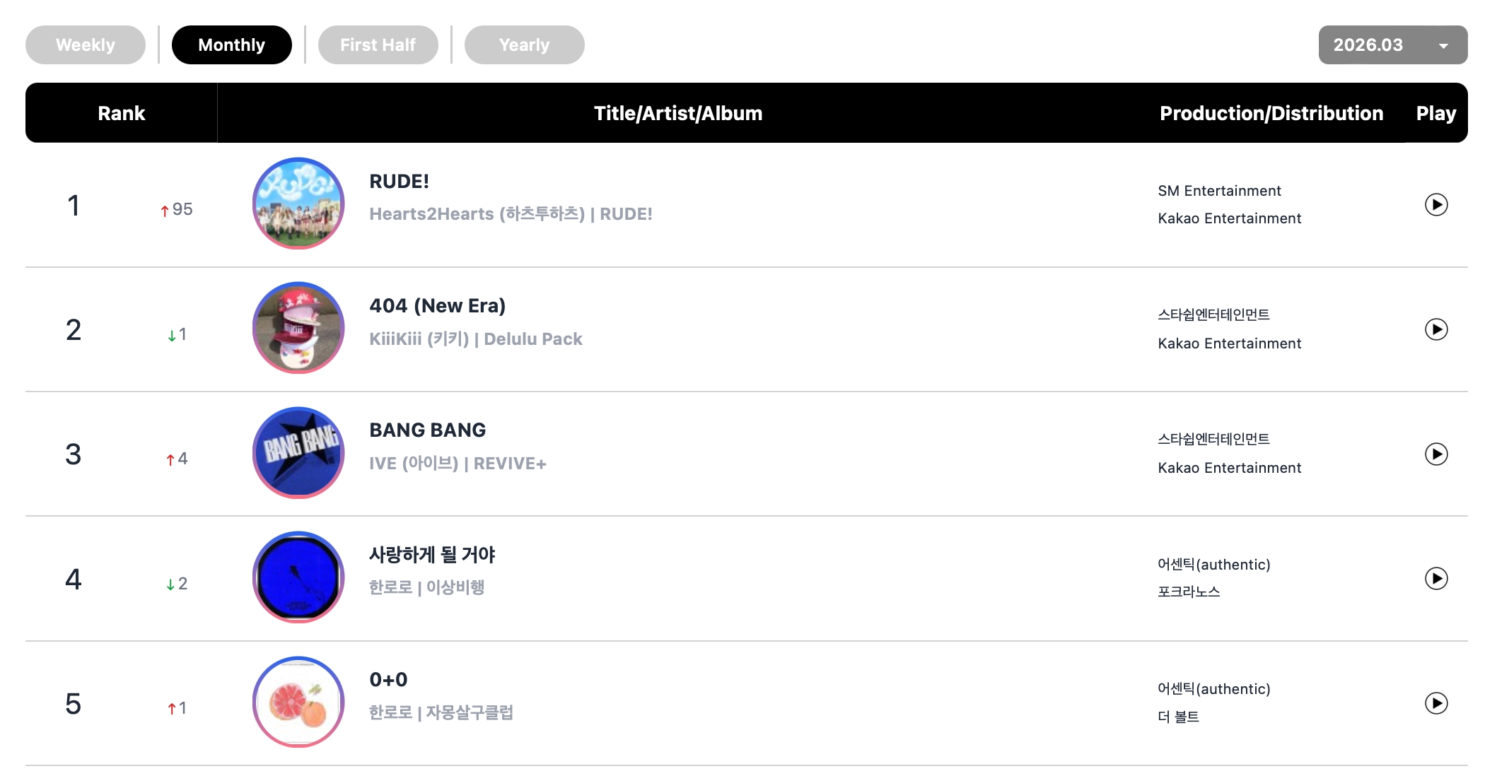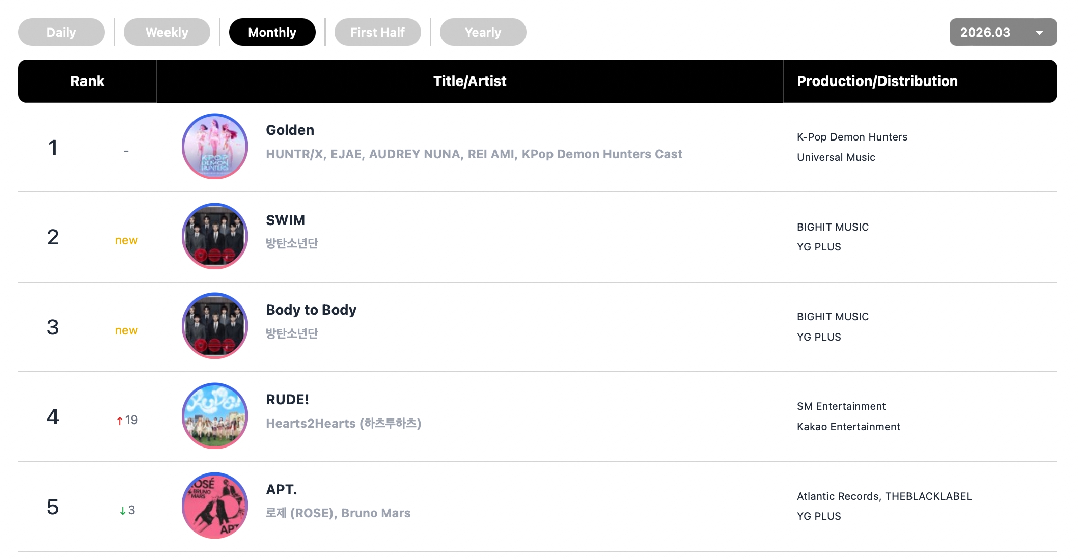 Hearts2Hearts’ “RUDE!” shot to No. 4 on the monthly chart, while BLACKPINK’s Rosé and Bruno Mars’ hit collab “APT.” came in at No. 5 for March.