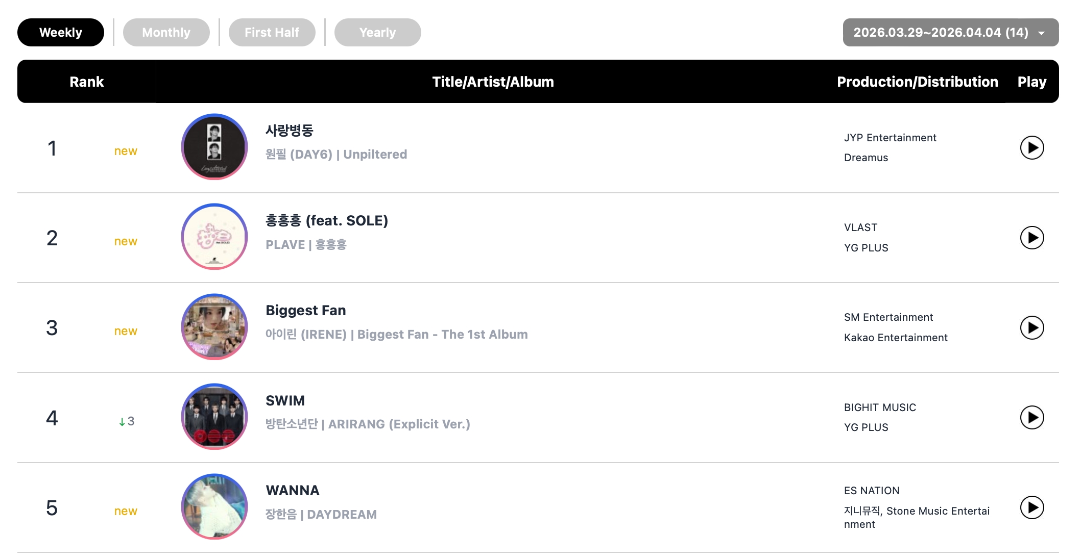 Irene’s new solo song “Biggest Fan” entered the chart at No. 3, followed by BTS’s “SWIM” at No. 4 and Jang Haneum’s “WANNA” at No. 5.