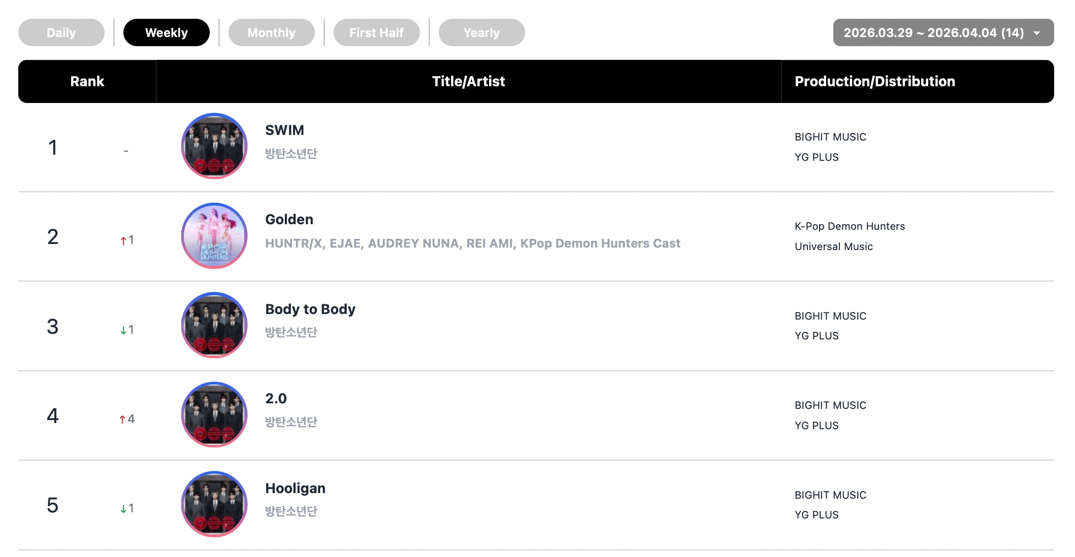 BTS dominated this week’s global K-pop chart, sweeping four out of the top five spots. “SWIM” held onto its spot at No. 1, with “Body to Body” at No. 3, “2.0” at No. 4, and “Hooligan” at No. 5.