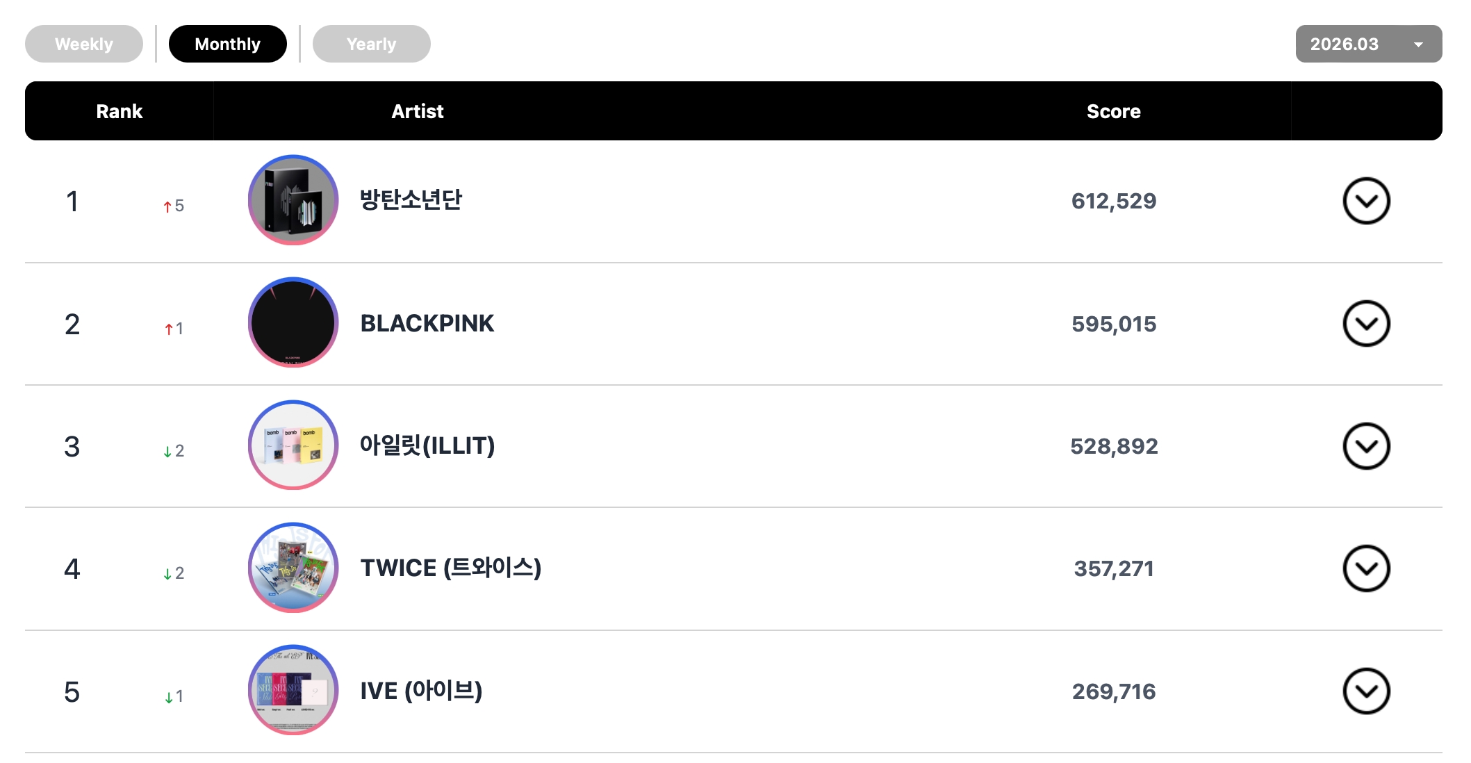 The top five artists on this week’s social chart were exactly the same as last week: BTS came in at No. 1, ILLIT at No. 3, BLACKPINK at No. 3, IVE at No. 4, and TWICE at No. 5.
