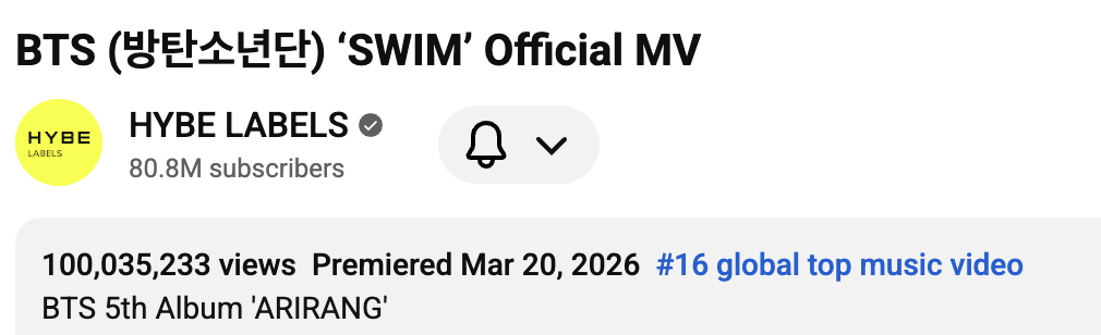 On April 15 at approximately 1 p.m. KST, the group’s music video for “SWIM” surpassed 100 million views. This means that it took approximately 26 days since the music video’s release on March 20 at 1 p.m. KST to achieve the feat, also making “SWIM” the first K-pop music video released in 2026 to reach this milestone.